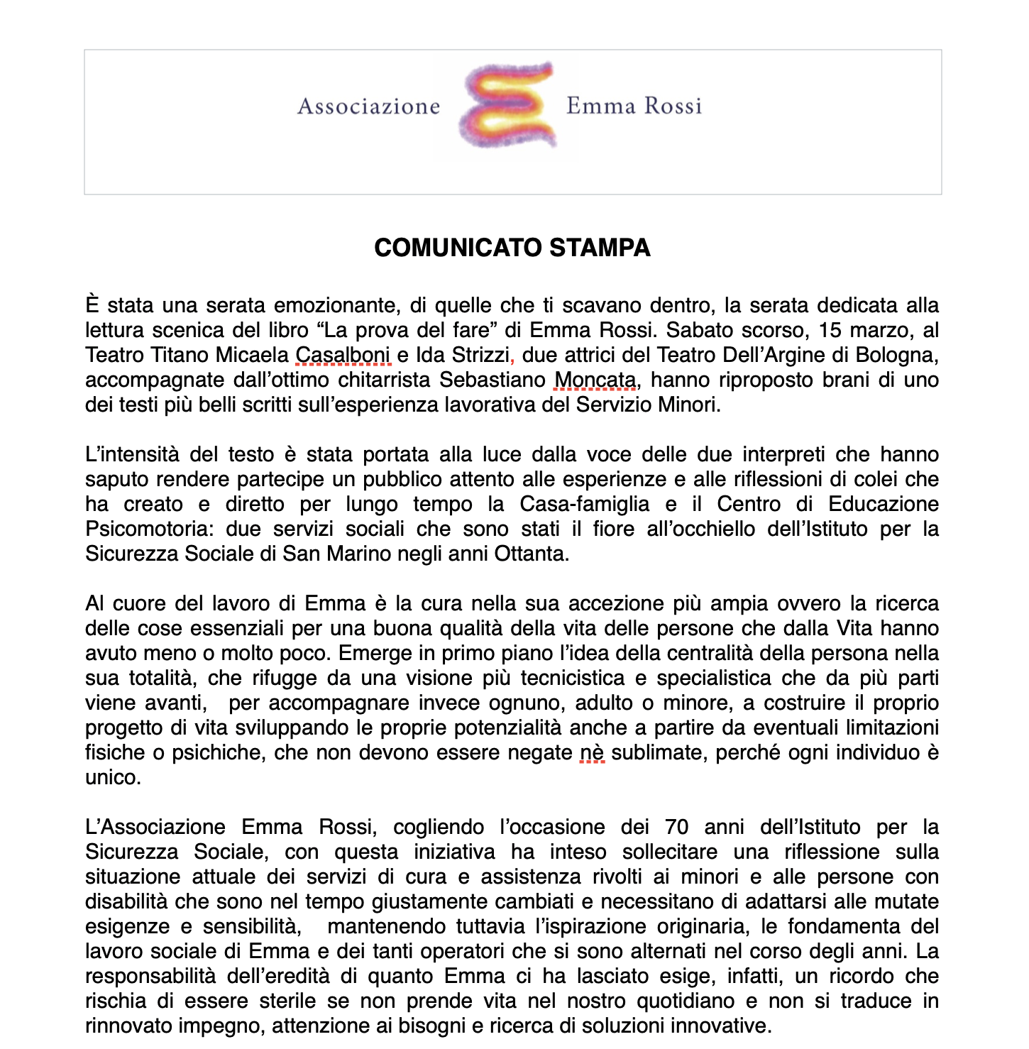 L’intensità del testo è stata portata alla luce dalla voce delle due interpreti che hanno saputo rendere partecipe un pubblico attento alle esperienze e alle riflessioni di colei che ha creato e diretto per lungo tempo la Casa-famiglia e il Centro di Educazione Psicomotoria: due servizi sociali che sono stati il fiore all’occhiello dell’Istituto per la Sicurezza Sociale di San Marino negli anni Ottanta.