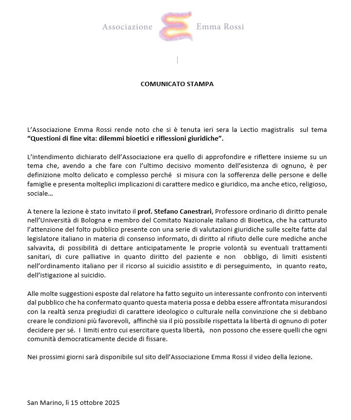 L’Associazione Emma Rossi rende noto che si è tenuta ieri sera la Lectio magistralis sul tema “Questioni di fine vita: dilemmi bioetici e riflessioni giuridiche”.